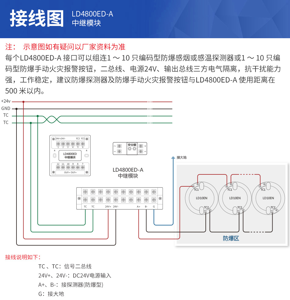 1、每個LD4800ED-A接口可以組連1~10只編碼型防爆感煙或感溫探測器或1~10只編碼型防爆手動火災報警按鈕。