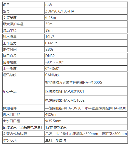 二、ZDMS0.6/10S-HA消防水炮 自動(dòng)跟蹤定位射流滅火裝置技術(shù)參數(shù)